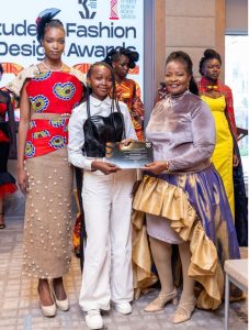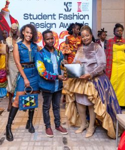1st position Student Fashion design awards Tony Mutua with his design being awarded by Sue Muraya